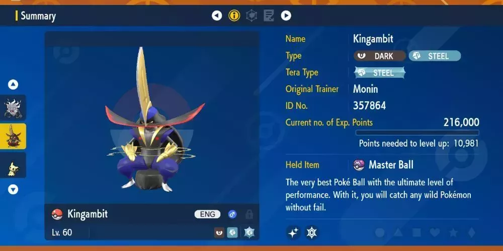 A partir de Pokémon Escarlata y Violeta, el favorito de los fans, Bisharp, recibió una evolución en forma de Kingambit. El tipo Acero y Oscuro parece un viejo samurái con un gran bigote y una pose tranquila pero preparada para la batalla. Su armadura roja en forma de capa ya tiene un aspecto estupendo, pero su variante Brillante luce aún mejor.
