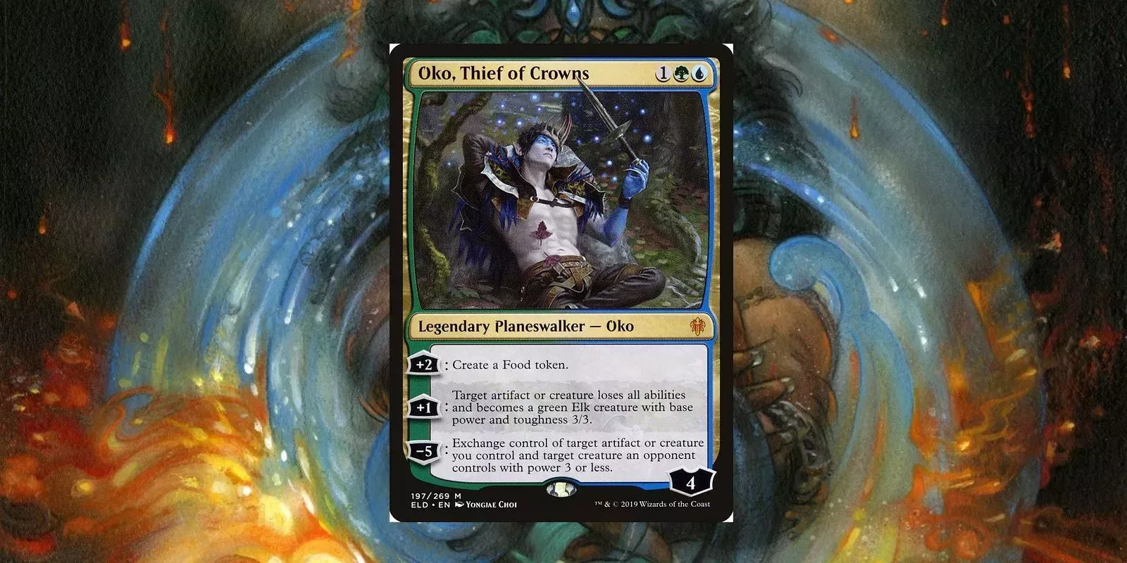 La infame carta de Planeswalker verde/azul Oko, ladrón de coronas fue ostentosamente poderosa desde el momento en que se imprimió en Trono de Eldena. Este Planeswalker de tres lanzamientos puede convertir casi cualquier artefacto o criatura en un simple Alce 3/3, lo que puede acabar con casi cualquier mazo.