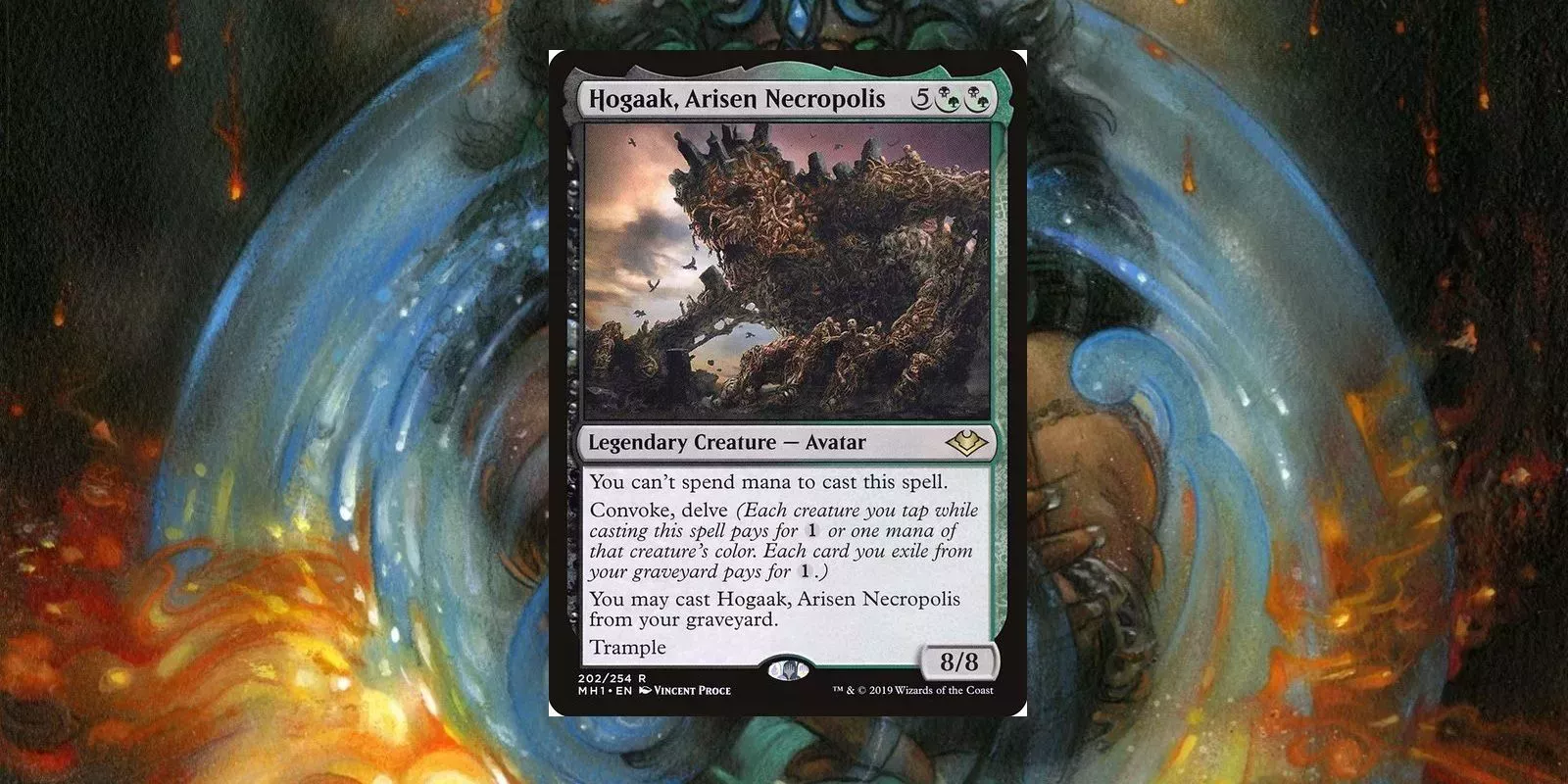 Hogaak puede lanzarse una y otra vez desde el cementerio, y sus sÃmbolos de maná hÃbridos negro/verde lo hacen aún más flexible que nunca. Ser un 8/8 con pisoteo no rompe el juego, pero si la criatura se puede lanzar tantas veces, es demasiado fuerte para el formato.