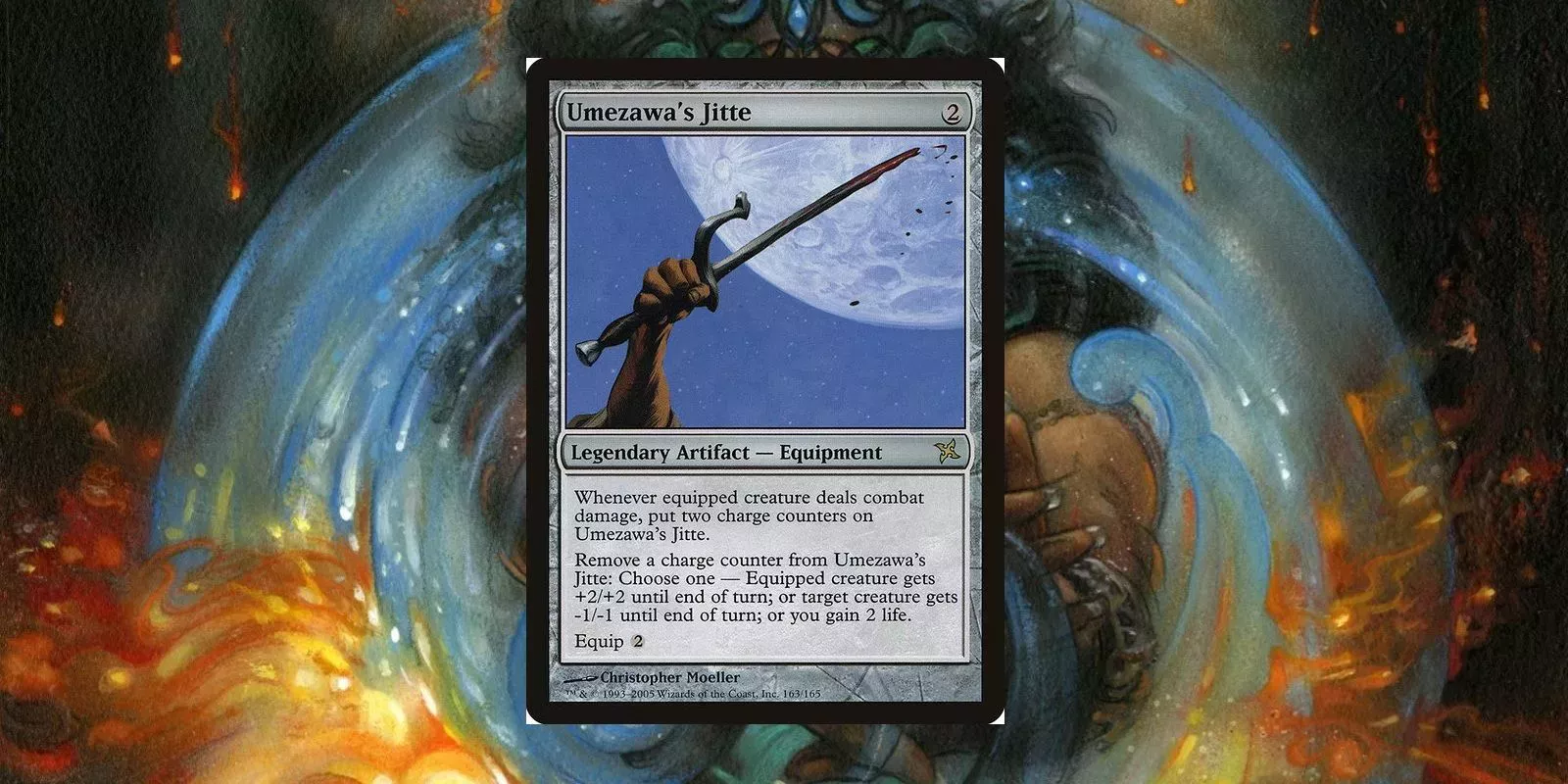 El Jitte de Umezawa puede obtener contadores sólo por infligir daño de combate, lo que es bastante generoso. Luego, el controlador del Jitte puede eliminar esos contadores de carga para aplicar una variedad asombrosamente amplia de efectos, entre los que se incluye la capacidad de matar criaturas, lo que ha provocado que el Jitte esté prohibido en Modern.