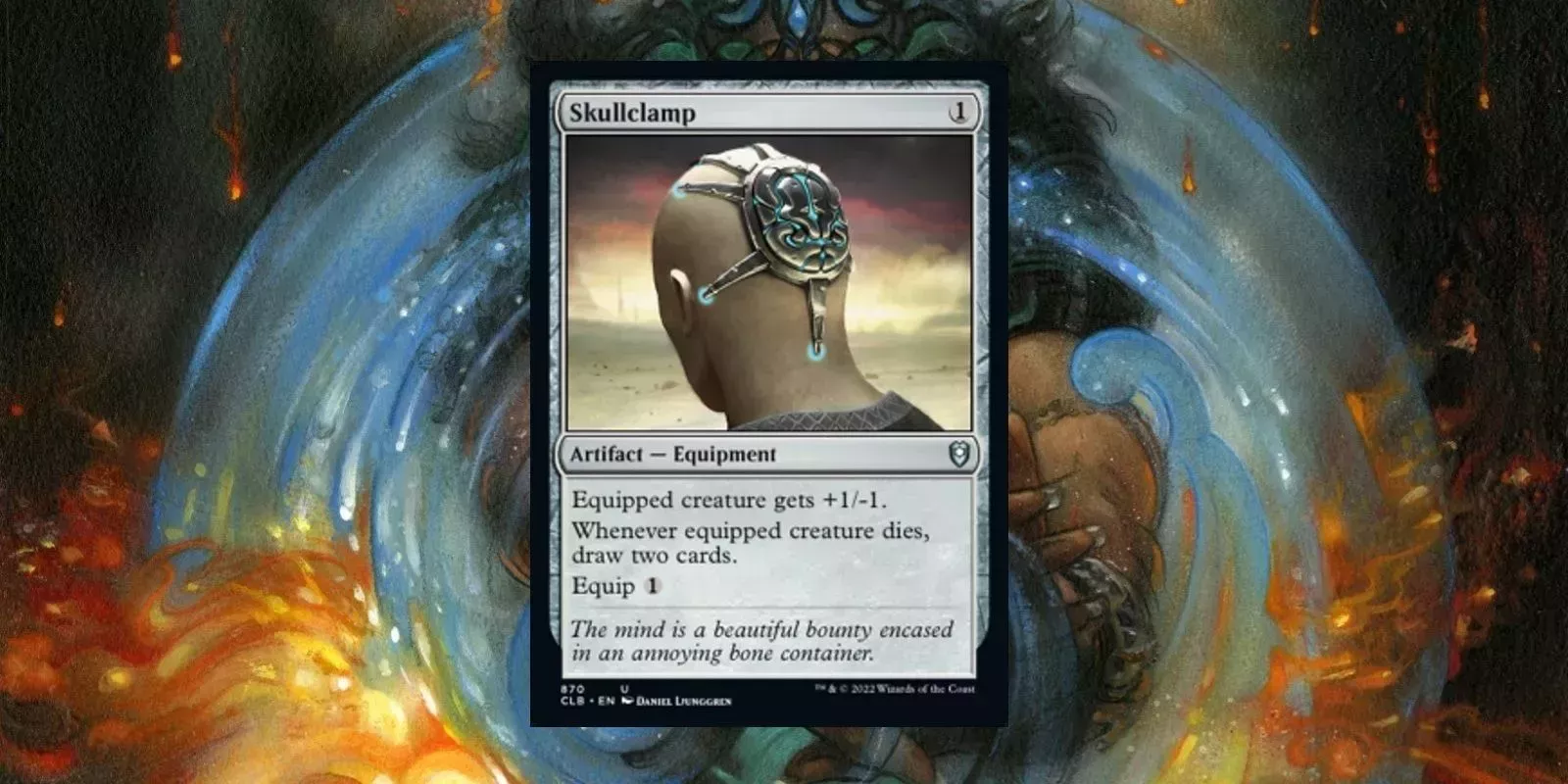 Al igual que el Jitte de Umezawa, el famoso Skullclamp es un artefacto incoloro que hace demasiado por su coste. De hecho, Wizards pretendÃa que el efecto +1/-1 fuera una desventaja, pero teniendo en cuenta el efecto "cuando la criatura equipada muere" de Skullclamp, ese -1 a la resistencia es realmente bueno.