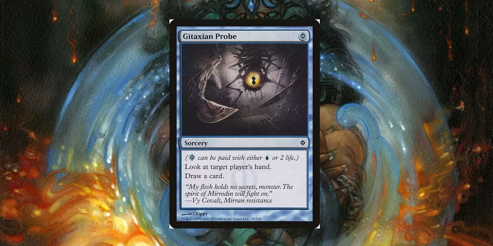 A primera vista, Gitaxian Probe parece perfectamente modesta, un pequeño hechizo azul que puede mirar la mano de un oponente y luego cantrip. Pero esta carta pirexiana, en los mazos adecuados, es demasiado. Por un lado, lanzar esta cosa por 2 vidas hace la vida demasiado fácil para los mazos de Tormenta, y eso no es todo.