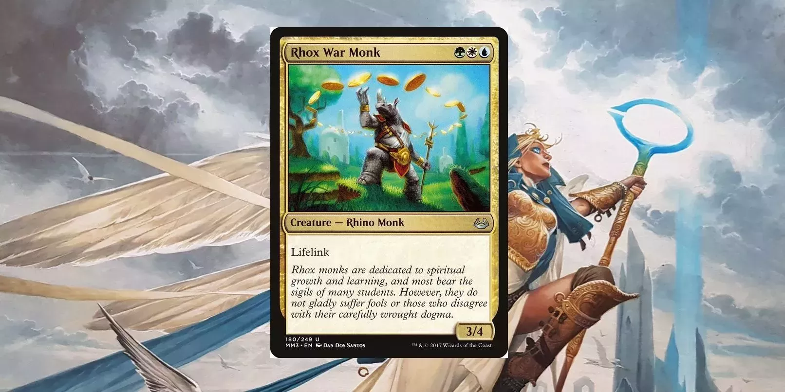 En su momento, Rhox War Monk era un básico en sus colores, e incluso hoy en día, un beater de 3/4 de enlace vital por 3 es bastante bueno. Sin embargo, el coste de maná de Rhox War Monk, muy elevado en función del color, y su falta de tipos de criaturas relevantes hacen que rara vez se juegue con él, ni siquiera en mazos de ganancia de vida.