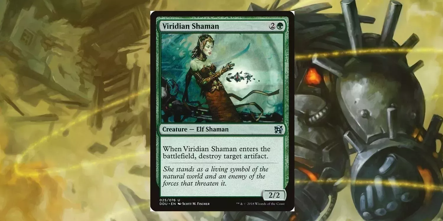 Por aquel entonces, los jugadores utilizaban cartas como Chamán viridiano para frenar a los poderosos mazos de artefactos. Era un paso vital, pero los jugadores modernos de M:TG tienen mejores criaturas destructoras de artefactos y encantamientos, como Qasali Pridemage.