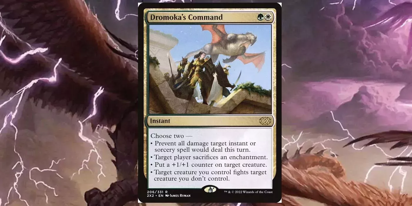 El mando de Dromoka forma parte de un ciclo de mandos bicolores de la colección Dragones de Tarkir. Hoy en día, los jugadores recuerdan este ciclo sobre todo por el Mando de Kolaghan, que es enormemente poderoso en formatos como Modern, pero el Mando de Dromoka se quedó atrás.