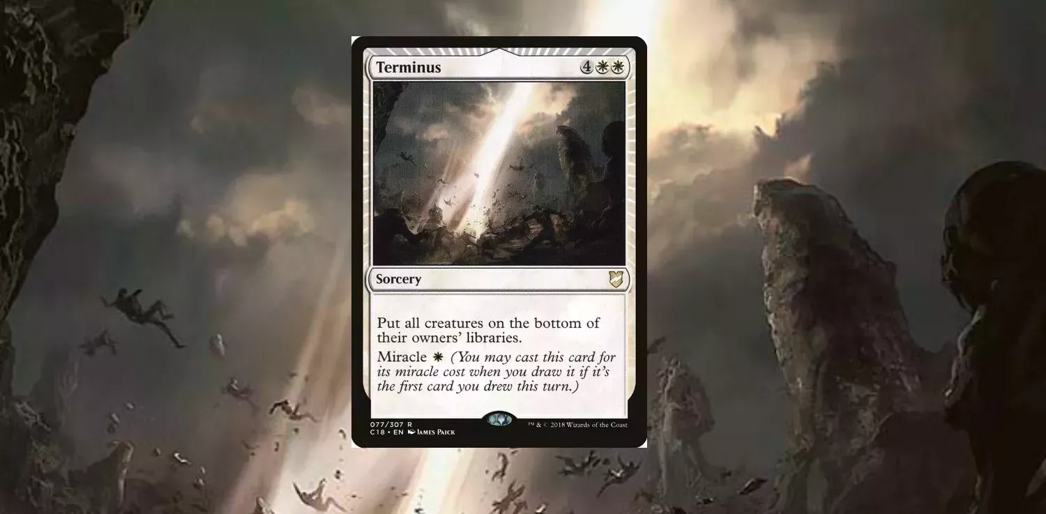 Los barridos de tablero son una gran herramienta para un mazo de control, especialmente en un formato multijugador como Commander. Terminus era un board wipe único porque, en lugar de destruir criaturas, las ponía en el fondo de las bibliotecas de los jugadores. Esto impide que los jugadores utilicen hechizos de recursividad o reanimación para recuperar sus criaturas, y es probable que la partida termine antes de que vuelvan a la parte superior del mazo.
