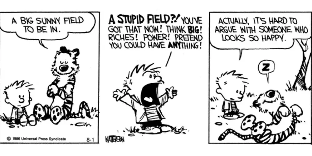 Aunque Calvin también aprecia cosas sencillas como estar en la naturaleza, sus constantes fantasías y ambiciones a veces le impiden disfrutar del momento. Hobbes ha dicho que su mayor sueño es estar tumbado en un campo soleado. Con gustos tan sencillos, es mucho más probable que Hobbes encuentre satisfacción en su vida.