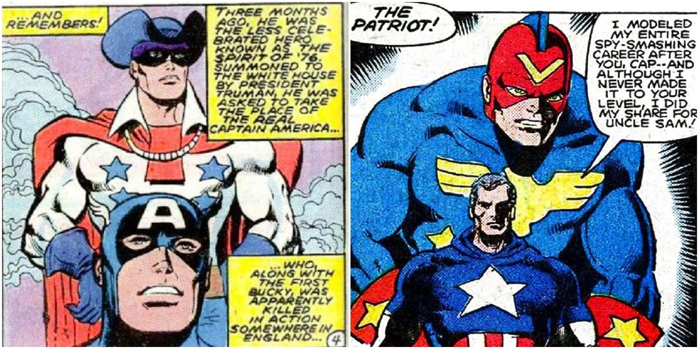 Tras su muerte, Bucky fue rápidamente sustituido por Betsy Ross, la Chica Dorada. Tras ella, Espíritu Libre (izquierda), Jack Flag (derecha), Nómada, Rick Jones y otros lucharon junto al Capitán América.