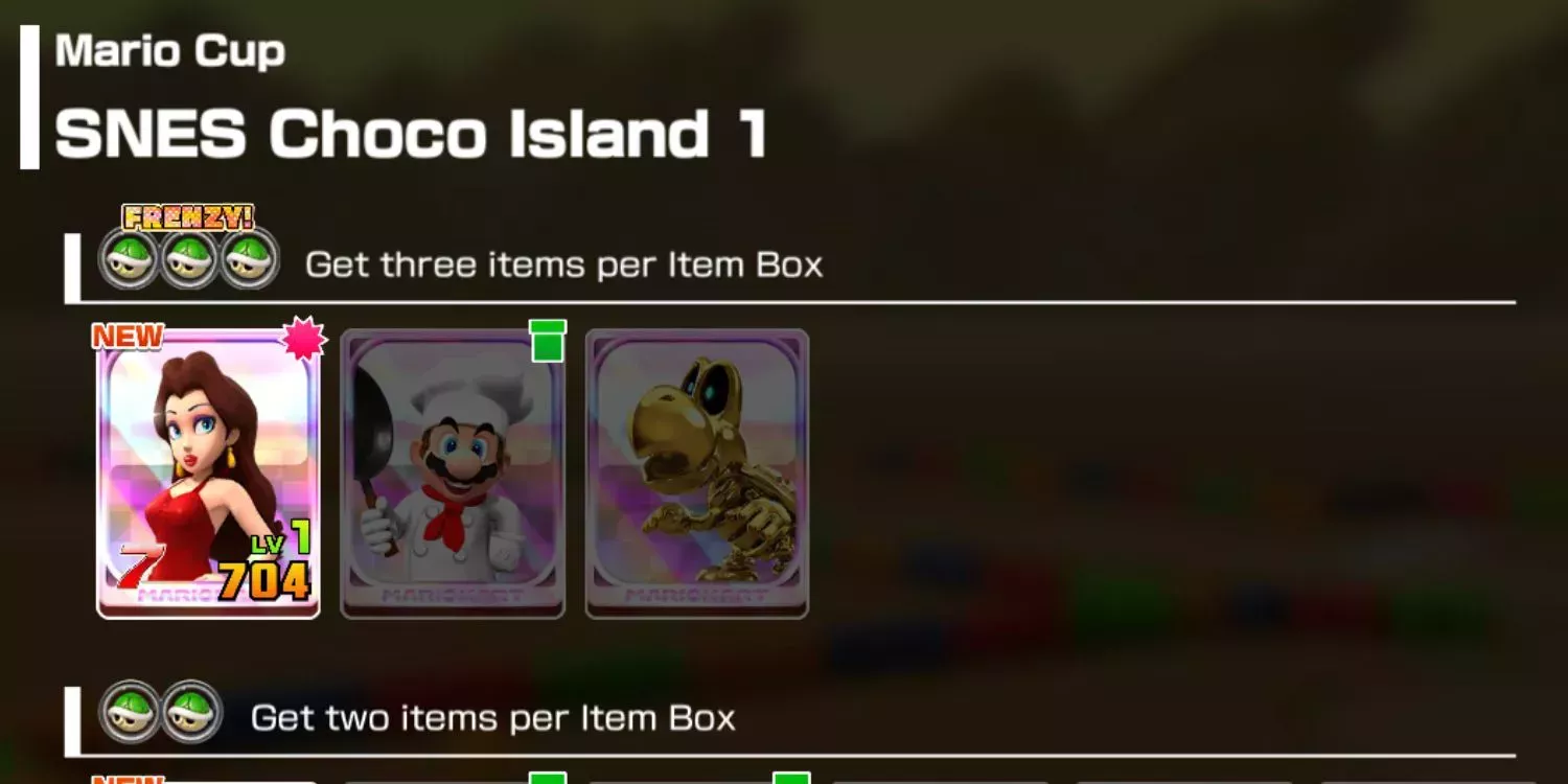 Dado que MKT es un juego gacha, los personajes, los karts y los planeadores necesitarán beneficios para que merezca la pena perseguirlos. Gran parte de estos beneficios son en forma de especialidad de pista. En MKT, los personajes pueden tener uno, dos o tres objetos a la vez, dependiendo de la pista en la que estén compitiendo. Más objetos significan más posibilidades de ganar, así como una mayor probabilidad de Frenesí (tener tres del mismo objeto a la vez, lo que lleva a un estado frenético en el que un corredor puede spamear ese objeto). En el caso de los karts y los planeadores, estos niveles suponen un mayor multiplicador de puntuación.