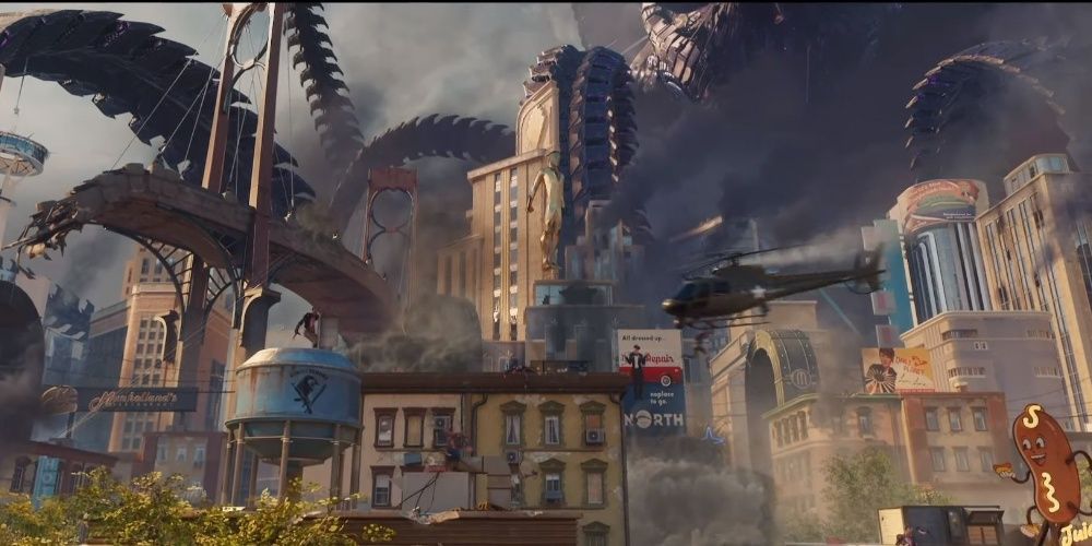 Como se muestra en el tráiler, Metrópolis parece ser la ubicación principal. También hay un vasto barco con forma de cráneo aparcado en el centro de la ciudad, que parece estar sufriendo mucha destrucción.
