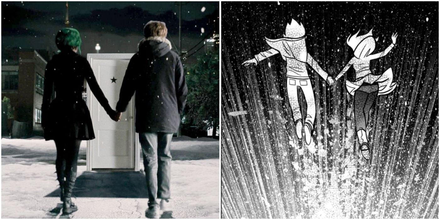 En Scott Pilgrim vs. The World , Scott vence a Gideon Graves, se reconcilia con su oscura contraparte Nega-Scott, y ata su relación con Knives Chau antes de seguir a Ramona por la puerta subespacial. Con todo, un gran ejemplo del ritmo más rápido de la película. En el último volumen del cómic, en cambio, después de vencer a Gideon, nos volvemos a unir a los personajes después de unos meses, donde Scott tiene su vida relativamente estable, toca en una banda de mierda con Kim Pine, y se despide de Knives cuando se va de la ciudad. Luego se dirige a través de la puerta con Ramona, hacia un futuro desconocido.