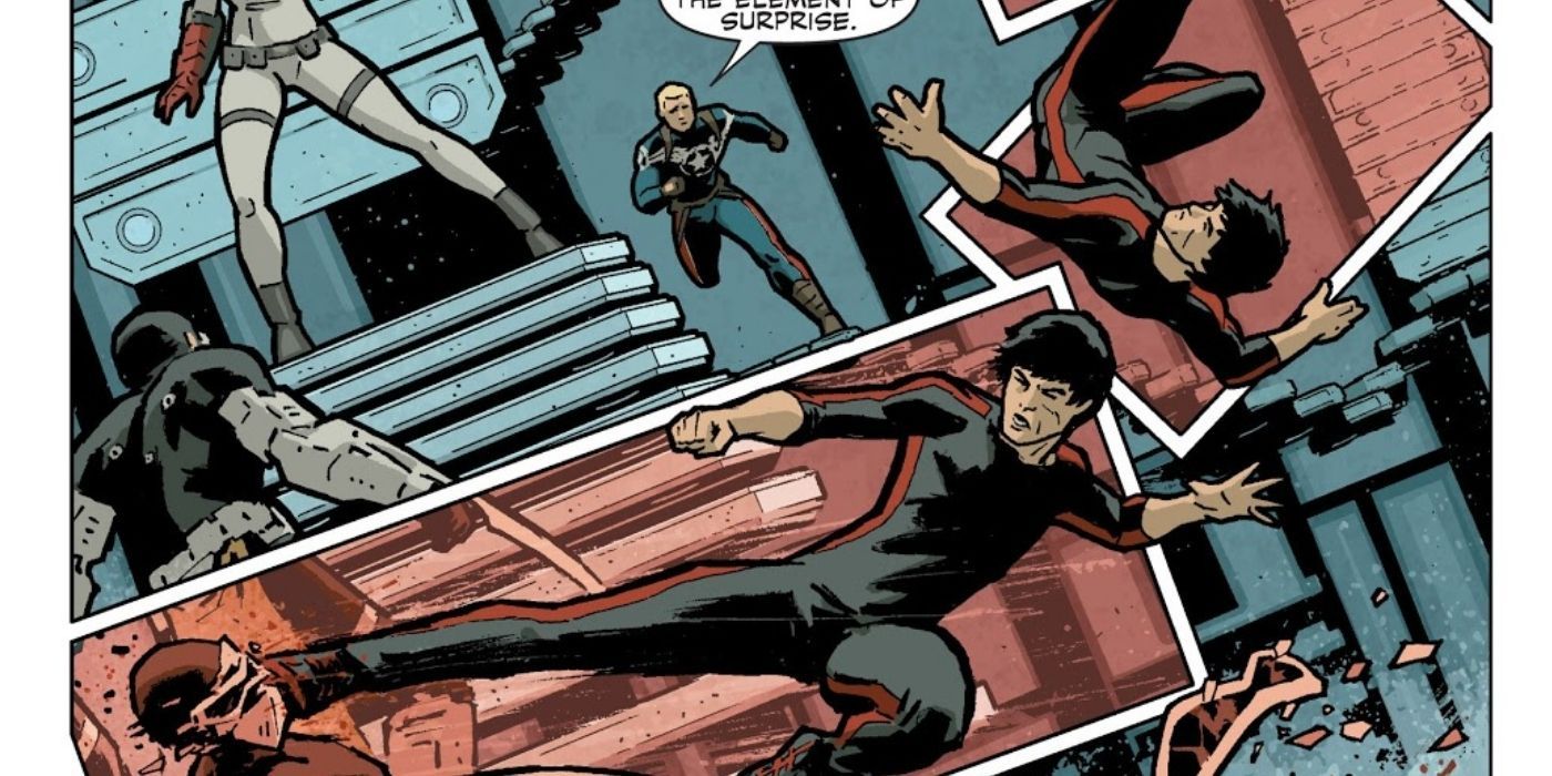 En esta historia, Steve Rogers dirigió una pequeña unidad en una base en otra dimensión que tenía sus propias reglas de física. Shang-Chi se abrió paso a través de hordas de enemigos, moviéndose por un nuevo entorno con sus propias reglas de gravedad, y haciendo que realmente funcionara a su favor.