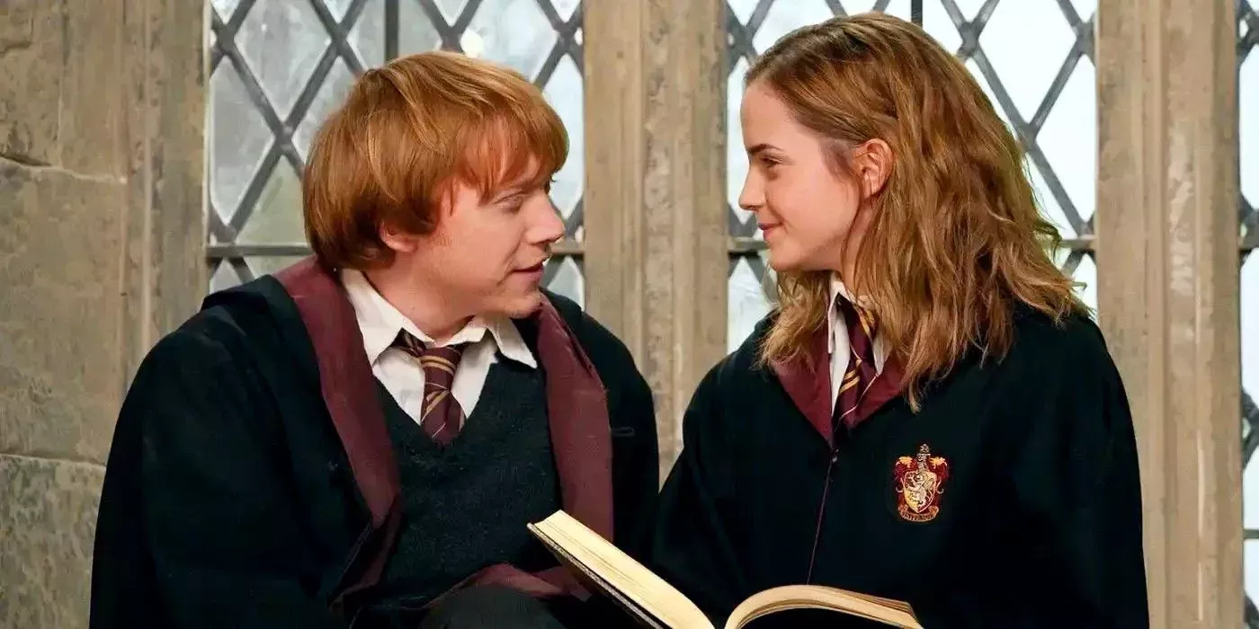 La mayor parte de su incipiente romance durante sus años en Hogwarts estuvo marcada por los celos, las discusiones y el coqueteo ocasional. A pesar de burlarse de Hermione cada vez que podía, Ron siempre se apresuraba a defenderla ante los demás, especialmente ante aquellos que la despreciaban por su falta de ascendencia mágica. Después de años de bailar alrededor del otro (y de volver loco a Harry en el proceso) los dos finalmente se juntaron durante la Batalla de Hogwarts, se casaron algún tiempo después y tuvieron dos hijos.