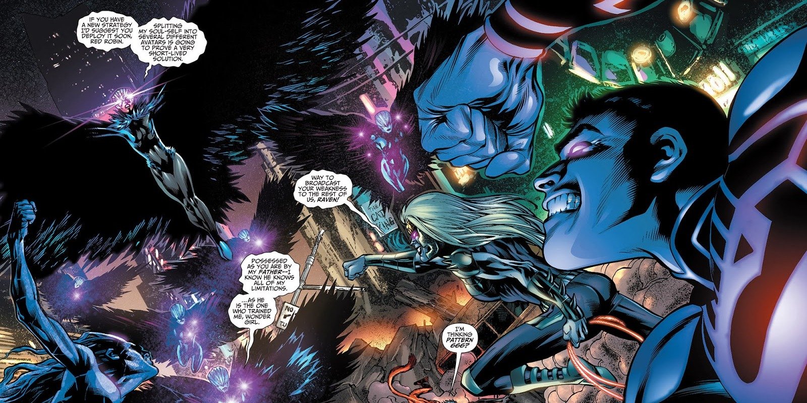 Raven es el conducto del poder devastador de su demoníaco padre Trigon. Debido a esto, ella ha entrenado toda su vida para controlar sus emociones, para que no desate accidentalmente la oscuridad dentro de ella. Durante los New Teen Titans, el alter-ego malvado de Raven toma el control y ella destroza a su equipo, arruinando la boda de Dick Grayson y Starfire en el proceso.