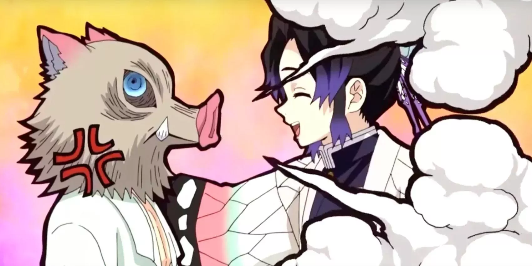 Inosuke estaba luchando, y Shinobu se burló alegremente pero con maldad de él, completando con imágenes tontas. Inosuke estalló, y resopló aliento de cerdo caliente sobre Shinobu para desafiarla y mostrar su determinación. Debía demostrar que sus palabras burlonas estaban equivocadas, o de lo contrario.