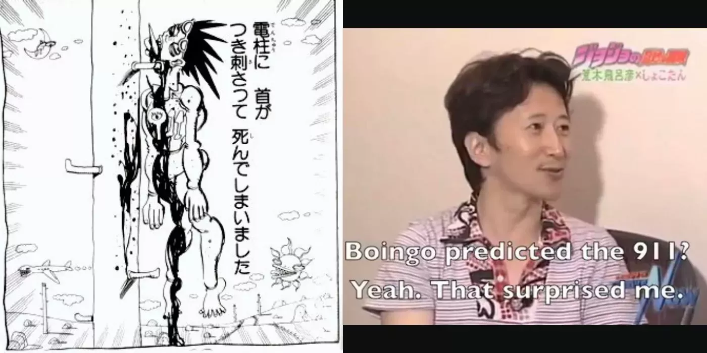 En el capÃtulo 189 se presenta a los fans un personaje llamado Boingo, cuyo Stand, Thoth, le otorga la capacidad de predecir el futuro en forma de imágenes abstractas. Entre estas visiones del futuro, Araki ilustra a un mercenario que lleva una camiseta en la que se lee "911". El personaje hace referencia a la hora, 10:30 AM, que es inquietantemente cercana al minuto en que se derrumbó el One World Trade Center a las 10:28 AM. En el panel siguiente, el mercenario está empalado en un poste telefónico, y en el fondo se ve un avión con cara de mala leche. Cuando se le preguntó por estos paneles, el propio Araki confesó que no tenÃa ni idea de por qué los habÃa dibujado asÃ.