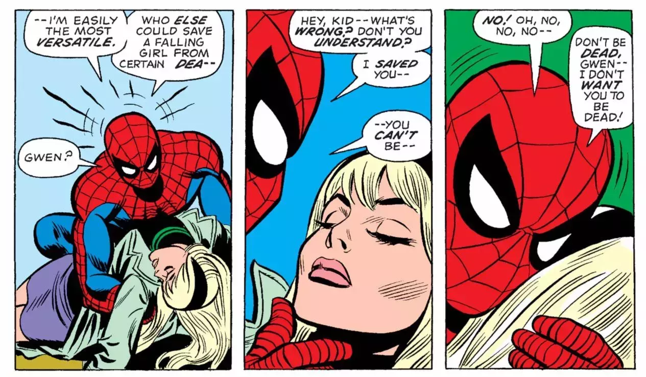 Puede parecer extraño para los lectores modernos considerar lo importante que fue Gwen Stacy en la vida de Peter en los años 60 y 70. Mary Jane puede parecer la pareja perfecta para Peter (dependiendo de la historia que se lea, al menos), pero cuando Gwen fue introducida en los cómics, estaba destinada a ser su única pareja. Por eso, para los fans de entonces, fue un shock increíble que muriera repentinamente por culpa del Duende Verde.