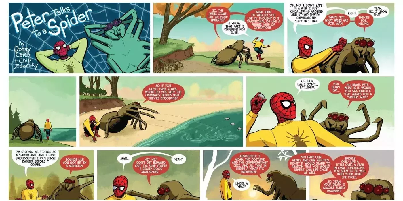 La capacidad de Spiderman de comunicarse con otras arañas ha pasado desapercibida para muchos fans. Entre los entusiastas de Spidey, se ha discutido mucho sobre el arco argumental "El otro", en el que Spiderman descubrió que podía comunicarse con las arañas y utilizó esa comunicación para desactivar una bomba. Sin embargo, en el Doctor Strange #390, de Donny Cates, Frazer Irving y Chip Zdarsky, Strange concedió el deseo de Peter de hablar con una araña como mascota, colocándolos en un reino alternativo en el que podían conversar. Aunque Peter está encantado con la oportunidad, la conversación entre ambos deja tanto a Peter como a la araña poco impresionados con la experiencia.