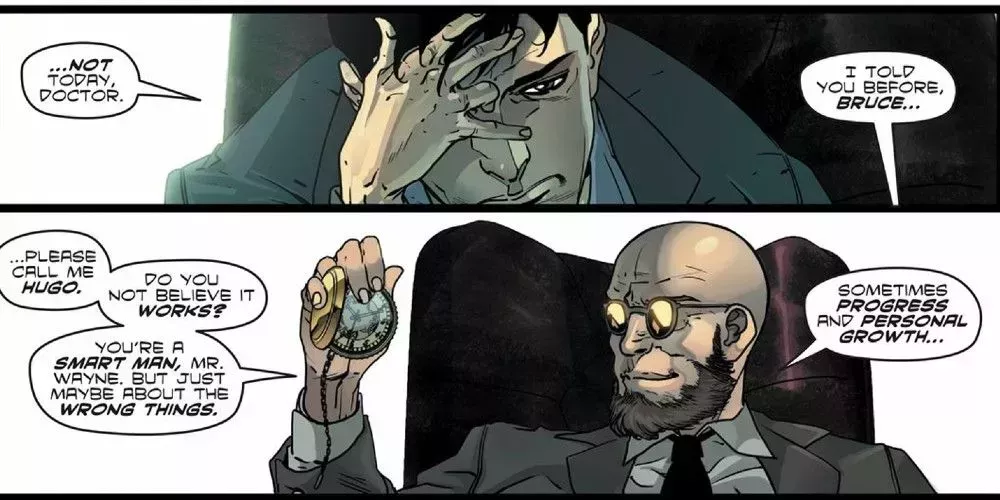 Wayne comienza a ver a Strange porque su amiga Dana le recomendó los servicios terapéuticos del doctor. Sin embargo, una vez que las finanzas y la salud mental de Dana disminuyen, Bruce alude al hecho de que sabe que las prácticas de hipnosis de Strange convencieron a Dana para que dilapidara su dinero en una cuenta en el extranjero. Incluso antes de ser un "villano" oficial de Batman, Hugo no tenÃa nada bueno.