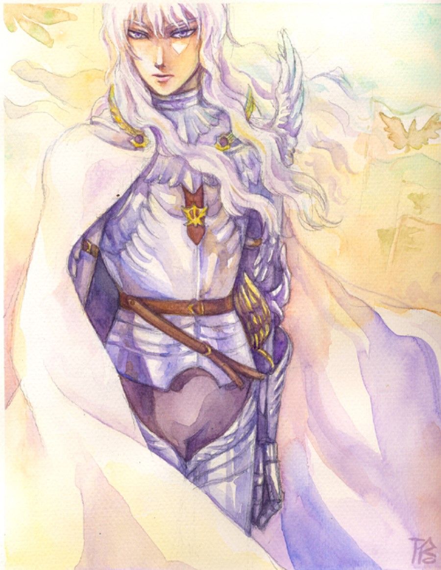 Rara vez las obras de arte no digitales aparecen en estas listas, pero ésta de Gtako merece ser la excepción a esa regla. Parece hecho con lápices de color en un papel, un arte que parece perdido hoy en día. Está muy bien sombreado, todo el fondo iluminado con rayos de luz, envolviendo a Griffith en una calidez que ya no tiene. Se puede ver que con su expresión, no hay felicidad ni alegría, sólo ojos de acero que ven su objetivo a su alcance.