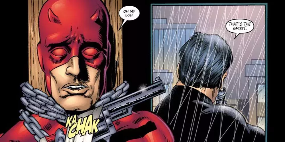 El debut del Castigador en la segunda temporada de Daredevil ofrece a los espectadores una rivalidad convincente que ahonda en las profundidades de la psique de ambos hombres. Los personajes se han enfrentado a menudo en las páginas de los cómics debido a sus filosofías opuestas respecto al asesinato, un tema recurrente en la ficción de superhéroes. Sin embargo, el ejemplo más crudo se produce en el número 3 de The Punisher, de Garth Ennis y Steve Dillon, titulado apropiadamente "El diablo por los cuernos".