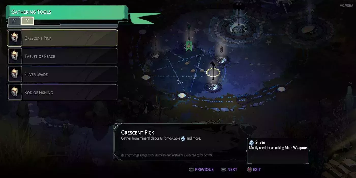 Algunos recursos pueden extraerse sin una Herramienta de recolección, y estos recursos también se utilizan para desbloquearlos. Hay cuatro herramientas de recolección en total: el pico de media luna, que extrae mineral; la tabla de la paz, que recoge recursos de las sombras; la pala de plata, que excava en busca de semillas que se puedan cultivar; y la caña de pescar, que permite pescar, otra actividad esencial para la recolección de recursos.