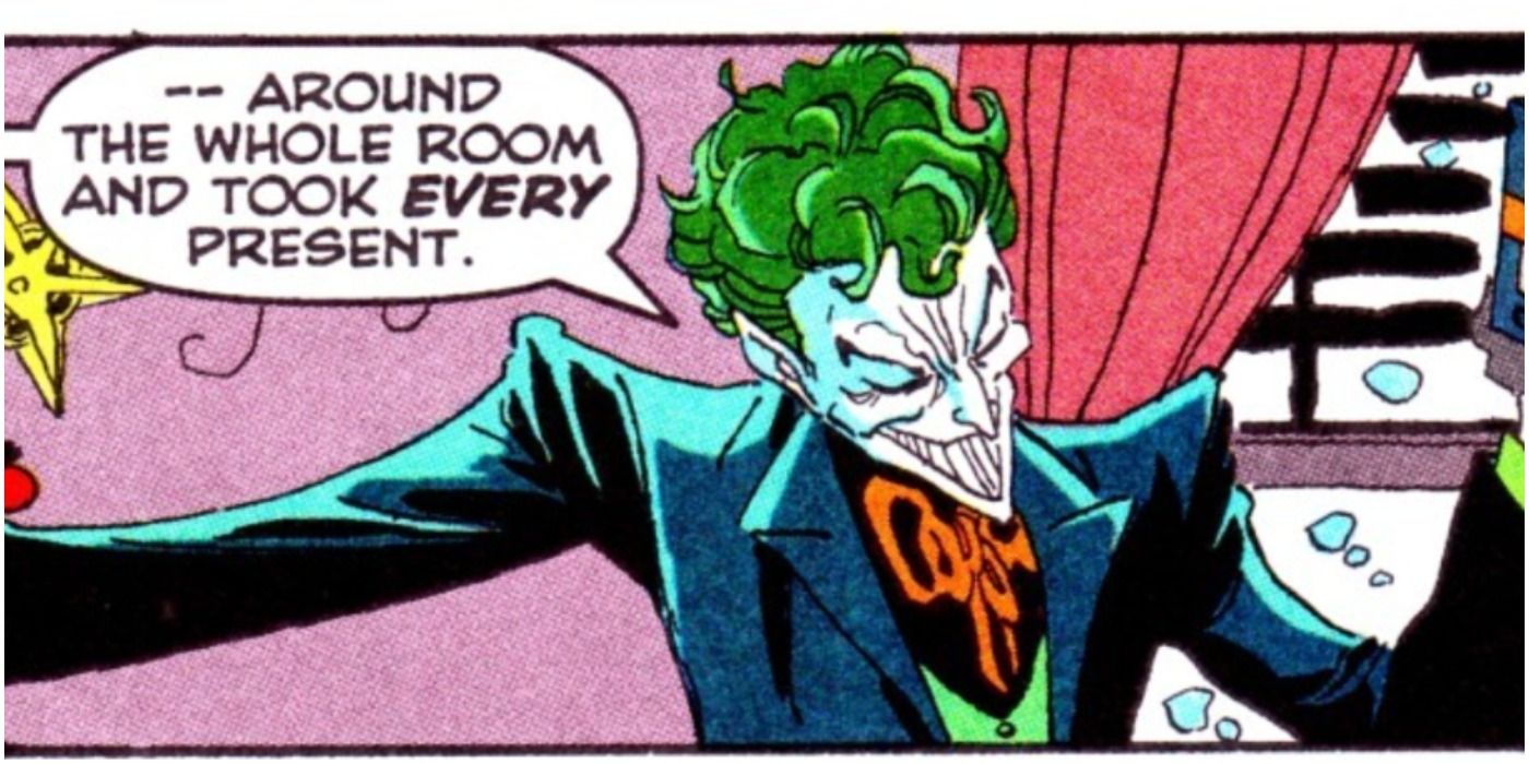 "Batman: El largo Halloween" de Jeph Loeb y Tim Sale, donde un asesino en serie comienza a eliminar a los criminales de Ciudad Gótica sólo en los días festivos, cubre todos los días festivos importantes del calendario. La serie de 13 números de la miniatura comienza con el titular y luego vuelve al final; la Navidad se trata en el capítulo 3. En este punto de la historia, Batman se desvía de sus intentos poco exitosos de encontrar al Asesino Navideño por la juerga navideña del Guasón.