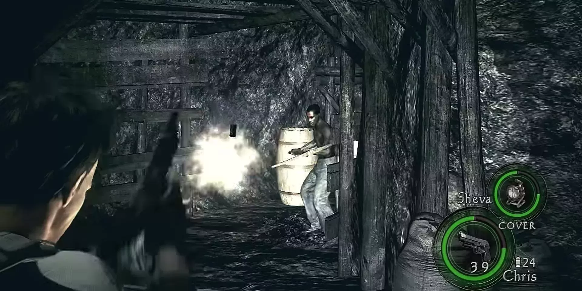 El nivel 2-2 deResident Evil 5 se desarrolla en gran parte en el pozo de una mina gigante. Chris Redfield y Sheva Alomar tienen que explorar la zona, pero ninguno de los dos tiene una fuente de luz convencional. En su lugar, uno de ellos tiene que coger una enorme linterna y usarla para iluminar su camino. Mientras se utiliza esta linterna, el personaje no puede usar ningún arma.