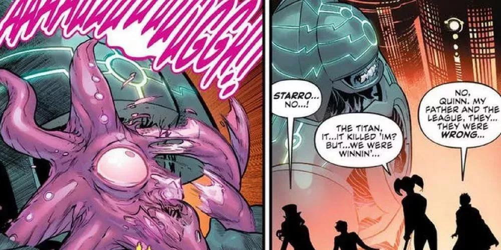 Con la vida del grupo amenazada, Starro utiliza el Biocinturón de Átomo para agrandarse, pero es destrozado en el proceso. Sin embargo, la distracción permitió al equipo escapar, por lo que el último acto de Starro le salvó la vida. Sin embargo, Starro sigue vivo, ya que Batman recuperó un trozo de su cuerpo de estrella de mar y lo conservó en un frasco. La Liga lo adoptó como Jarro y ahora sirve como mascota no oficial de la JLA.