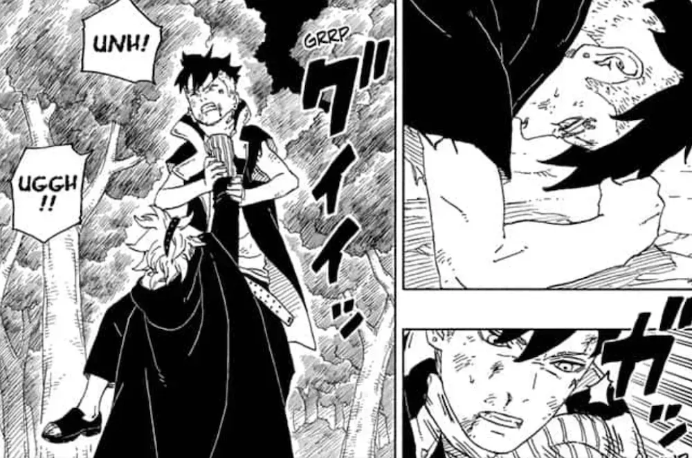 Aun así, es una paliza total cuando Code acorrala al adolescente en el bosque a las afueras de Konoha. Kawaki quiere negociar, ofreciendo su vida para salvar la Hoja Oculta culpándose de la muerte de Isshiki. Pero a Code no le interesa la absolución ni el perdón, y utiliza sus bandas de teletransporte, su brazo mutado y su fuerza para doblegar a Kawaki.