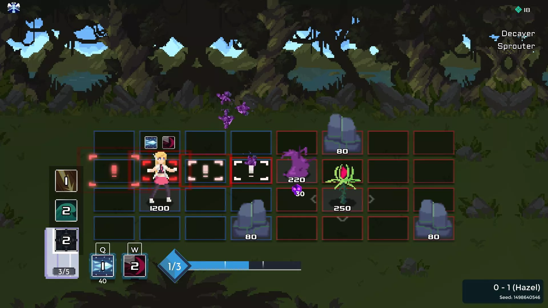 Los enemigos en el juego te atacan con fuego que puede apuntar a uno de los dieciséis cuadrados del lado izquierdo del campo. Tienes, como mucho, unos segundos para apartarte de estos ataques, lo que significa que gran parte de tu ancho de banda mental está ocupado en tratar de esquivar. Esto está bien en un juego como Dark Souls o Hades donde estás limitado a un puñado de opciones de ataque y puedes centrarte en esquivar mientras utilizas un par de ataques sinérgicos diferentes. Pero One Step from Eden ofrece a los jugadores una baraja completa de diferentes hechizos que consumen maná y aplican diferentes efectos mecánicos. Solo puedes usar dos de ellos a la vez, pero es casi imposible considerar cuál es el óptimo para la situación y a la vez evitar los ataques enemigos.