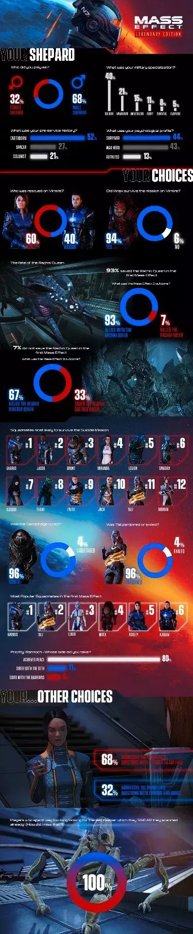 Mass Effect es una serie en la que las decisiones de los jugadores en el juego tienen consecuencias duraderas en los personajes y la galaxia que les rodea. La última entrega de la franquicia, Mass Effect: Legendary Edition, no es una excepción. El desarrollador BioWare ha recopilado muchas de las decisiones que los jugadores tomaron colectivamente a lo largo de la trilogía en una infografía, que incluye estadísticas sobre cómo los jugadores respondieron a un periodista curioso en particular. Atención, hay spoilers por delante.