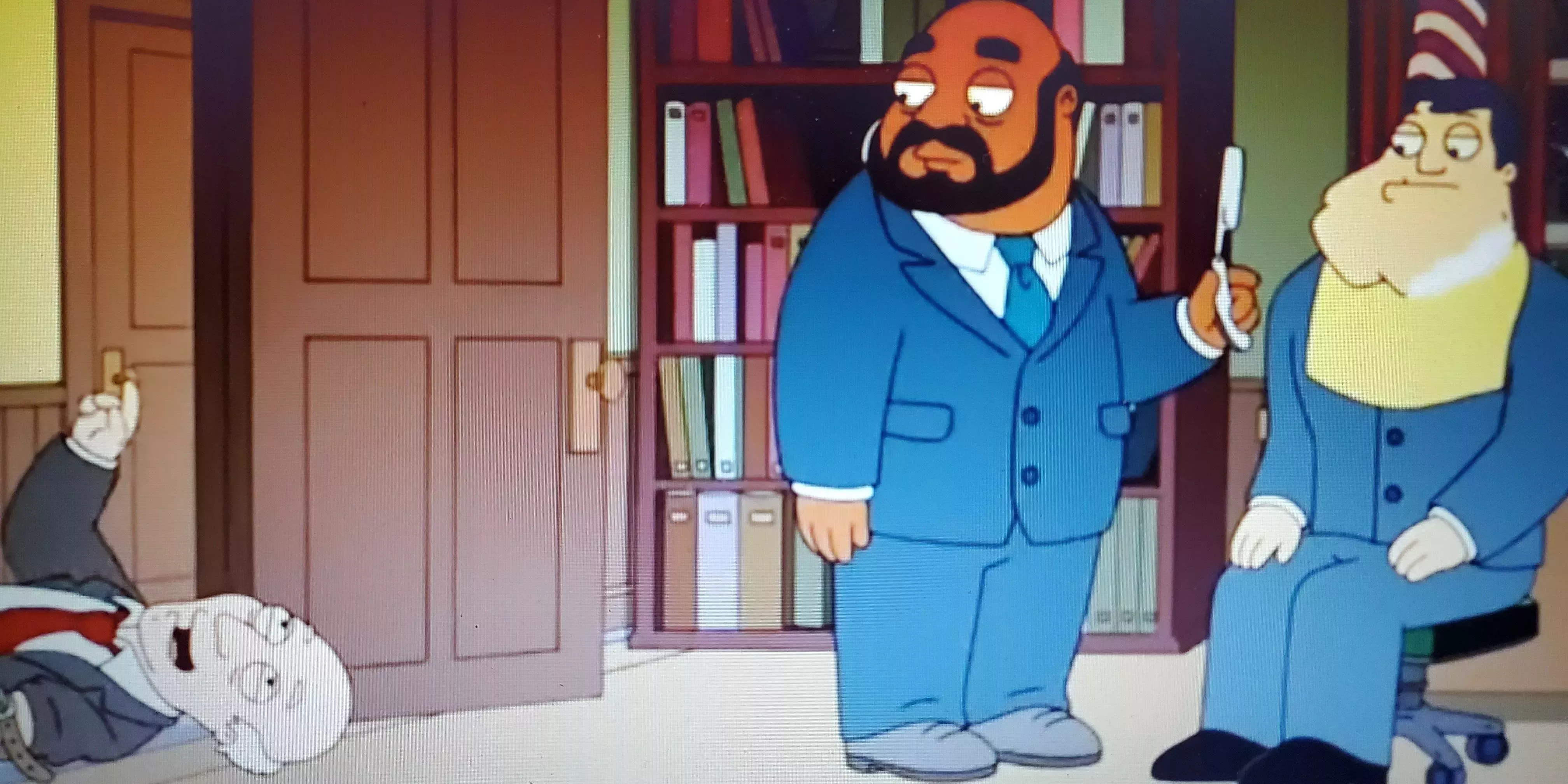 Durante una salvaje broma de misterio de asesinato que la familia le está gastando a Roger, Avery se emborracha antes de tiempo y tropieza de forma hilarante con la casa de la familia Smith. Al ver al director Lewis afeitando la cara de Stan, le pregunta al barbero si se dedica a la depilación de hombres y procede a pronunciar la declaración anterior antes de desmayarse en el suelo.