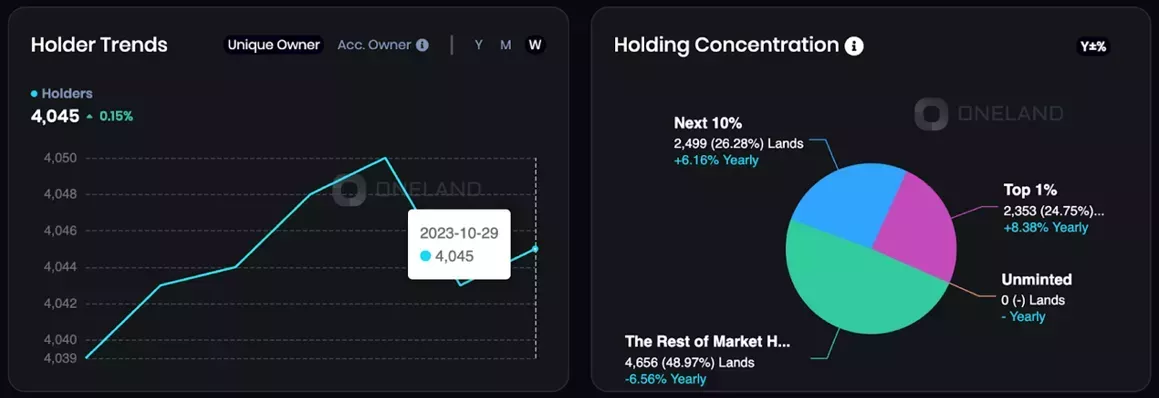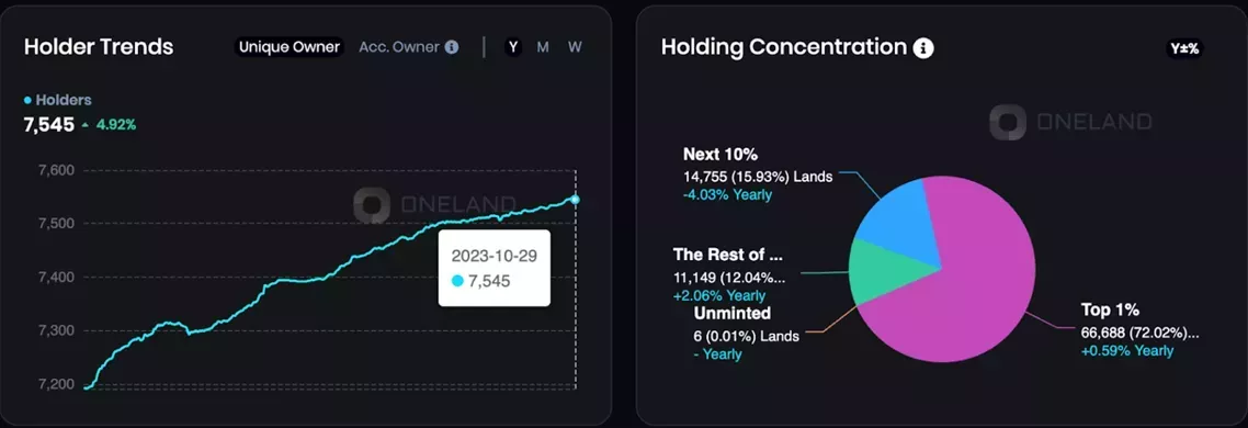 Incluso en un mundo ajetreado como Decentraland, los precios más altos (que otros proyectos, bar Otherside & HYTOPIA) siempre significarán pocas ventas en un mercado bajista; esta semana se vieron sólo 7, el cap de LANDs del proyecto cayendo en más de 5k ETH a 135,483 ETH. Pero también puede ser que pocos estén dispuestos a vender fuera del metaverso OG: el número de titulares de LAND sigue aumentando.