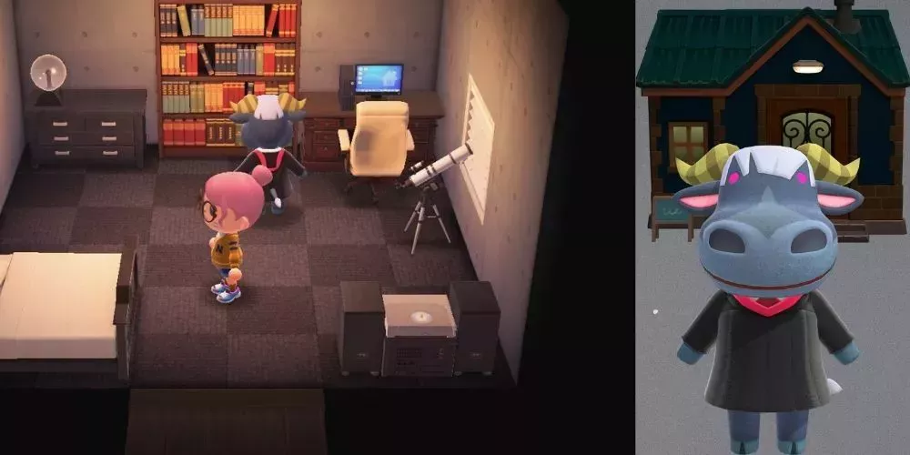 Rodeo tiene una casa bastante normal, con una cama, una estantería, un telescopio y un escritorio. Sin embargo, por fuera, sus paneles de madera oscura combinados con pintura negra son la decoración casera de Halloween perfecta para la isla de cualquier jugador.