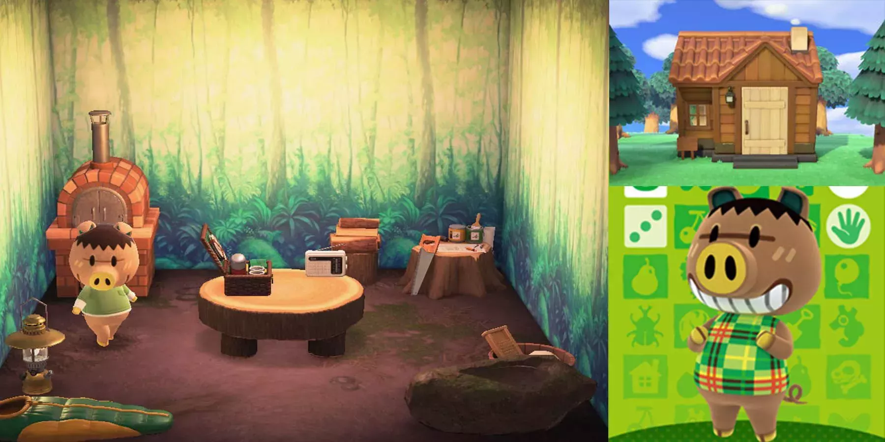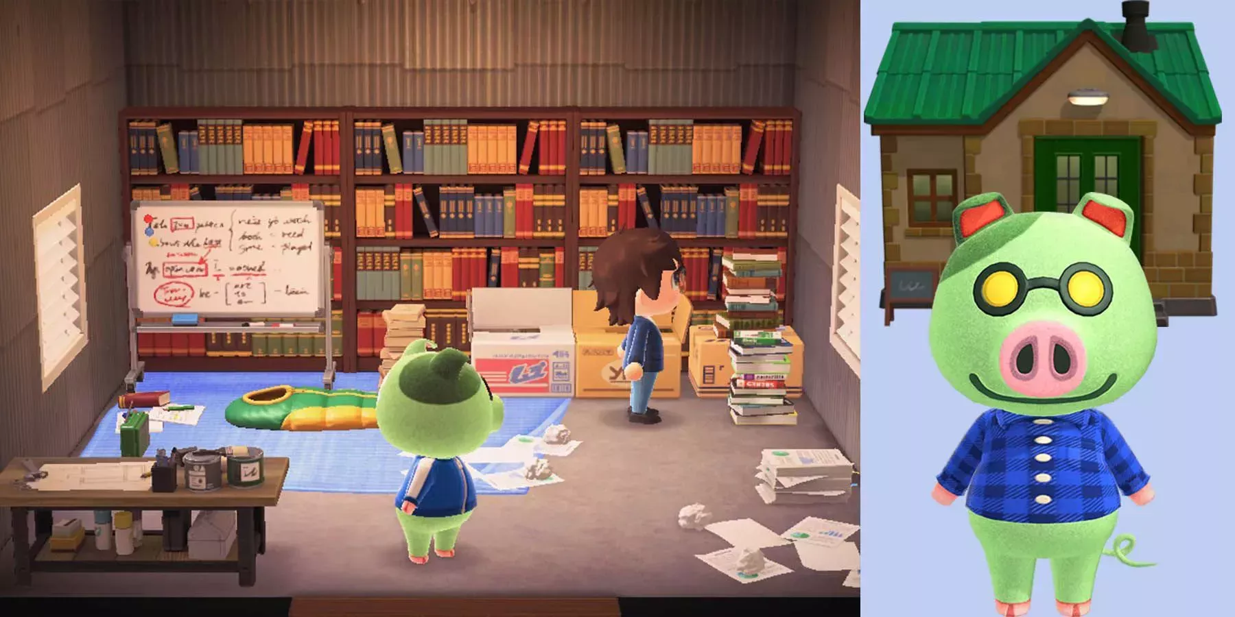 El exterior de la casa de Cobb es de ladrillo visto, con tejado y puerta verdes. En el interior es donde entran en juego las vibraciones de científico excéntrico. La pared del fondo de su casa está llena de estanterías con libros, y Cobb tiene una pizarra llena de notas. Hay cajas de cartón llenas de más libros que aún no han sido desempaquetados y pilas de papel esparcidas por todas partes. Dale a este cerdo una bata de laboratorio y será un científico isleño espeluznante y zombificado para Halloween.