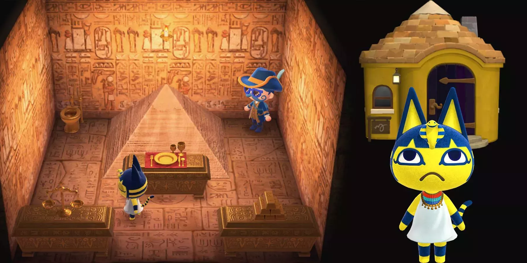 El exterior de la casa de Ankha es amarillo liso, con un tejado de piedra color canela y una puerta con acento dorado púrpura. Al entrar en su casa, parece que los jugadores se han transportado a una tumba egipcia con paredes revestidas de jeroglíficos, una pirámide gigante y muebles de oro suficientes para complacer a un faraón. Ankha frunce el ceño constantemente y nunca sonríe en ninguna de sus apariciones en Animal Crossing.
