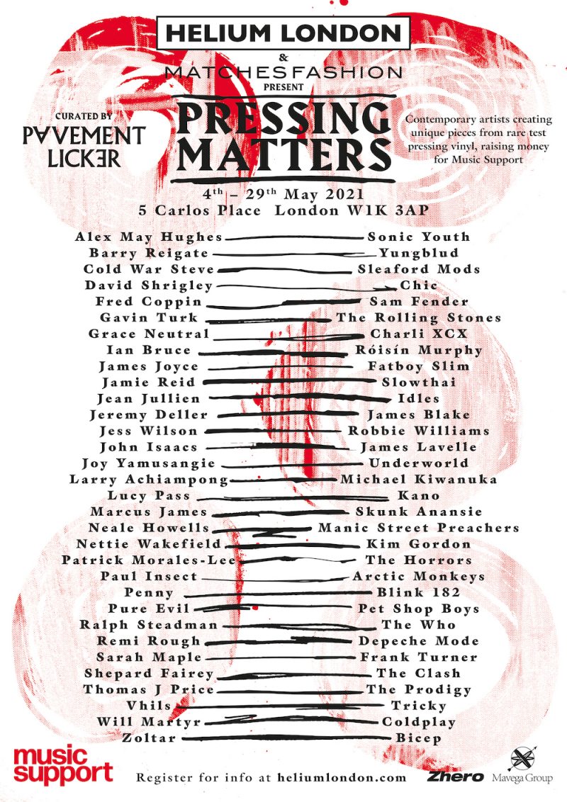 Pressing Matters", creada por Helium London y comisariada por Pavement Licker, verá cómo los artistas crean obras de arte únicas a partir de vinilos raros y prensas de prueba, que se presentarán en una exposición de un mes de duración y luego se subastarán.