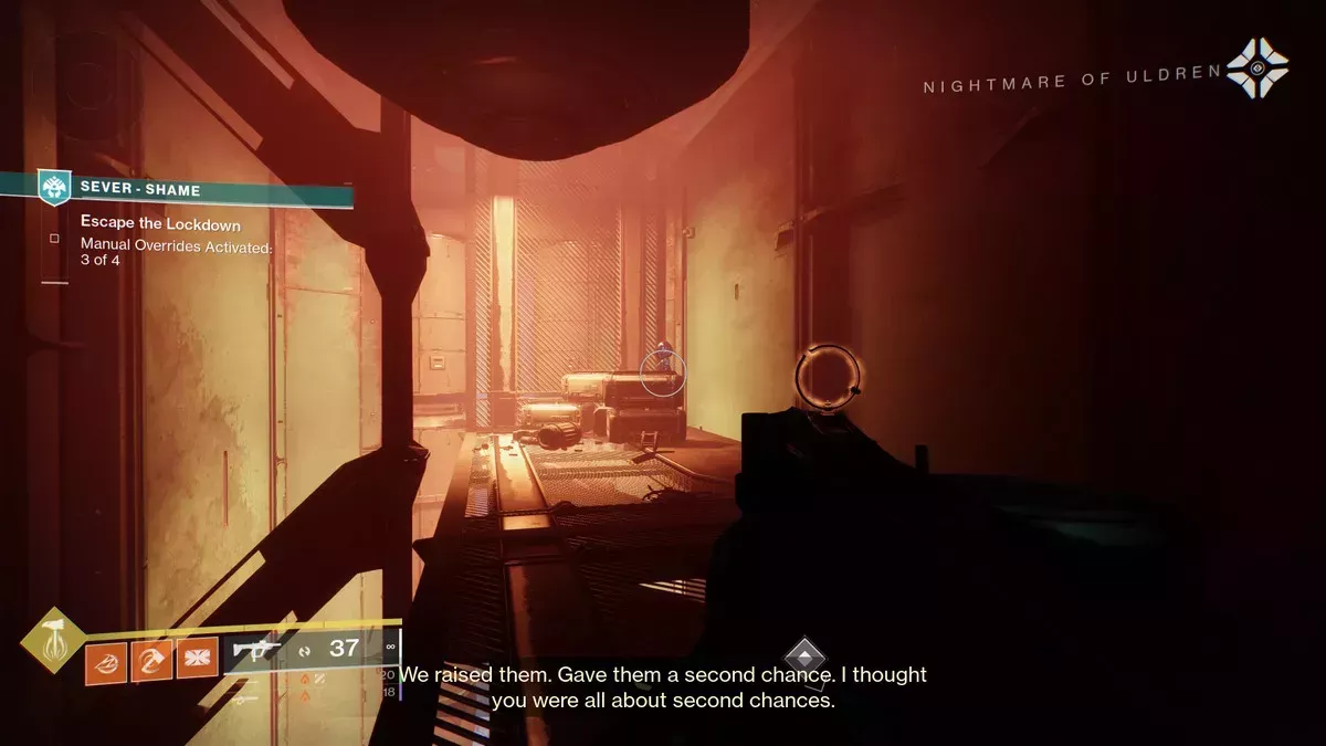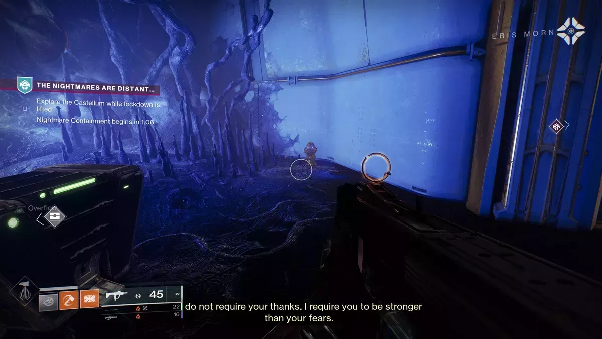 Por desgracia, la única forma de abrir esta puerta es tener suerte. Cuando completes una Contención de Pesadilla de nivel 3, aparecerán dos cofres detrás de dos de las cinco puertas cerradas alrededor de la arena. Si el cofre aparece detrás de la puerta cerrada que se ve arriba (la más alejada del combate con el jefe), podrás abrir la puerta y conseguir el cabezón. Si no, tendrás que volver a vencer al jefe de nivel 3 y esperar a tener suerte. Pon un mod de localización de cofres en tu Ghost para que esto sea más fácil.