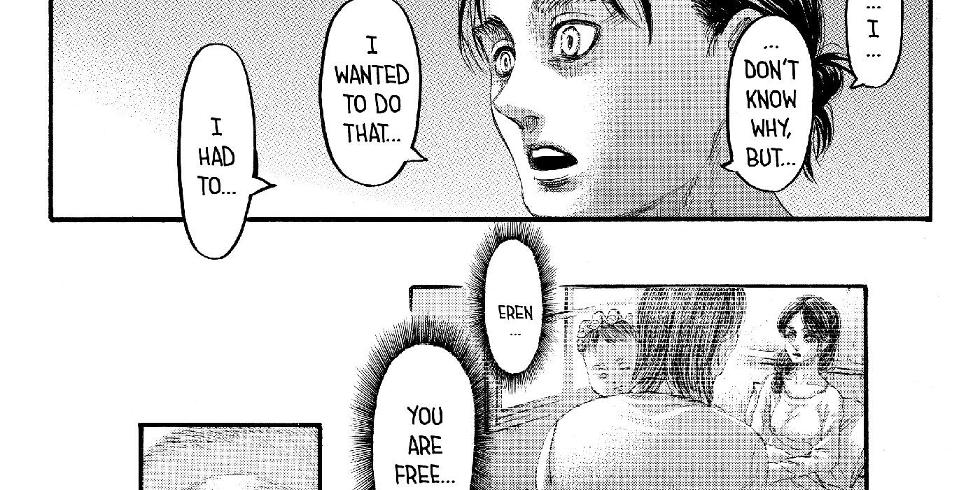 Aunque estarÃa bien volver a ver el mundo de Attack on Titan a través de los ojos de Eren, el anime deberÃa evitar justificar o restar importancia a sus horrendas acciones. Esto es algo que el manga vacila un poco; durante su conversación final con Armin, su amigo le agradece que se haya "convertido en un asesino en masa" para salvarlos.