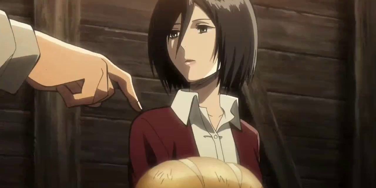 Para proteger a Eren, Mikasa miente y afirma que Sasha pasó gas. Más tarde en el episodio, hay un montaje de Mikasa y Sasha interactuando entre sí. Primero, vemos que Sasha se agrava con Mikasa por mentir. En la siguiente toma, Mikasa recoge un pedazo de pan. Creyendo que Mikasa le va a dar el pan, como disculpa, Mikasa se lo come hilarantemente, delante de ella. Más tarde Mikasa arbitrariamente le da a Sasha un pedazo de pan, sin su consentimiento. ¿Por qué Mikasa no le dio el pan a Sasha? Más importante aún, ¿no entiende los límites?