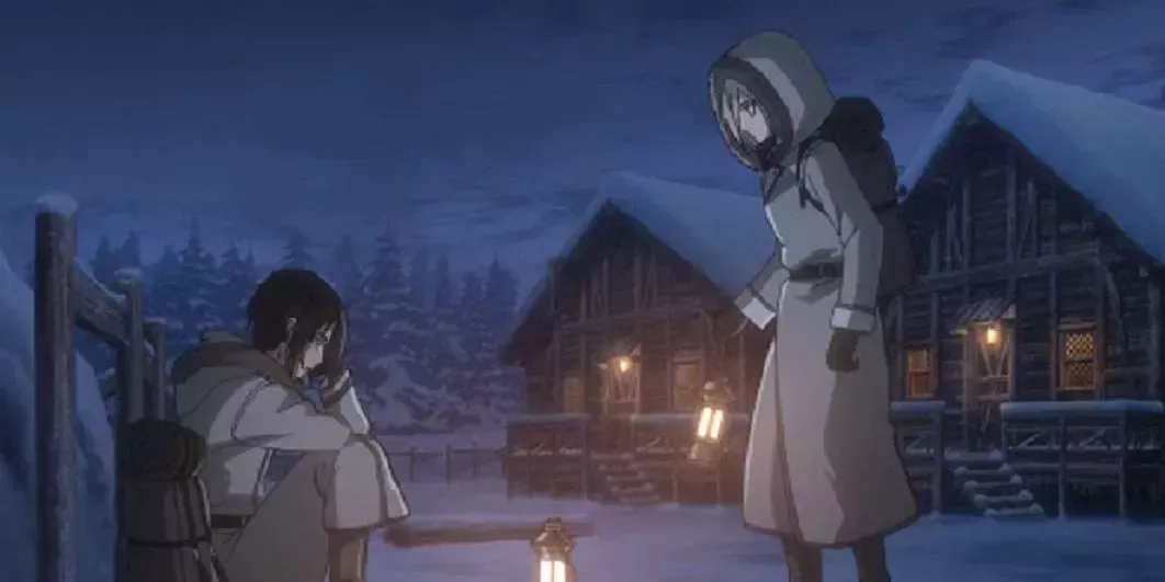 Historia encontró a Daz en medio de una ventisca e intentó llevarlo de vuelta a la cabaña de los exploradores. Al darse cuenta de que su aventura estaba condenada, Ymir accedió a ayudarla atravesando la montaña como el Titán Mandíbula.