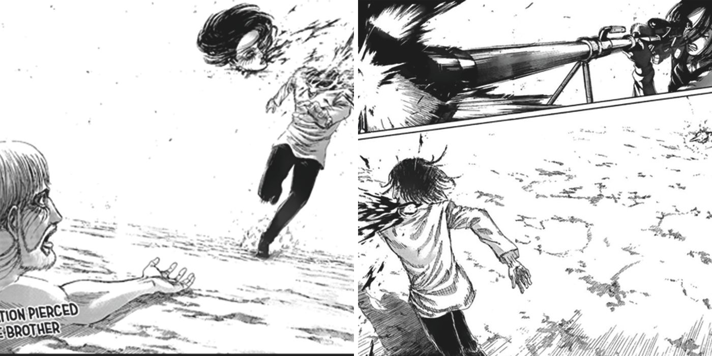 Cuando Eren se libera de su Titán e intenta tocar la mano de su hermano mayor, Gabi coge un rifle y le dispara a la cabeza, matándolo aparentemente. Sin embargo, antes de que Eren muera, su cabeza cortada aterriza en las manos de Zeke y consiguen hacer contacto dentro de la Coordenada, lo que les permite activar el poder del Titán Fundador.