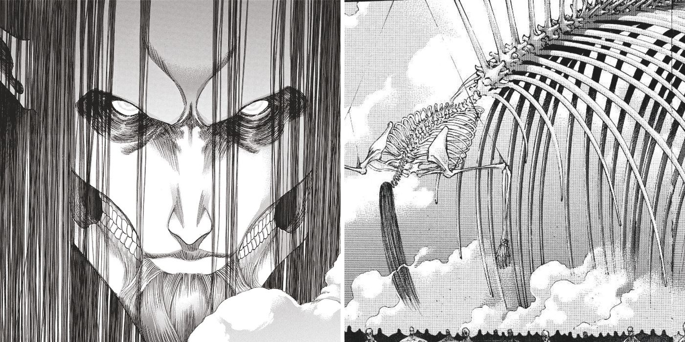 Cuando Eren revela sus verdaderas intenciones a Zeke dentro de la Coordenada, se convierte en la primera persona que le dice a Ymir que ya no es esclava de nadie y que destruirá el mundo que la hizo sufrir. El extraordinario resultado de que Eren consiguiera controlar todo el poder del Titán Fundador fue su transformación en un gigantesco esqueleto épico, así como el despertar del estruendo.