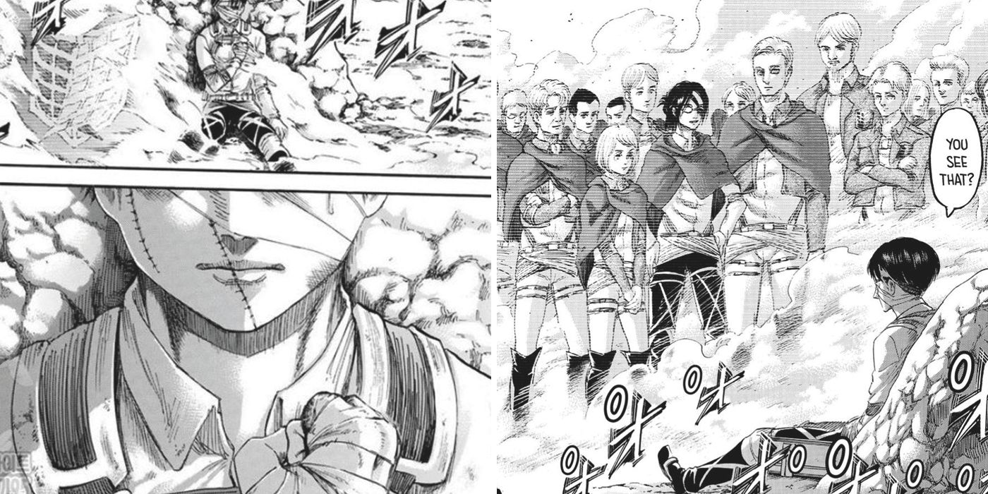 Uno de los paneles del manga más comentados del capítulo 139 fue el de Levi despidiéndose de sus compañeros caídos, incluidos Erwin y Hange. Cuando todos ellos aparecen frente a él por última vez, Levi hace un último saludo.