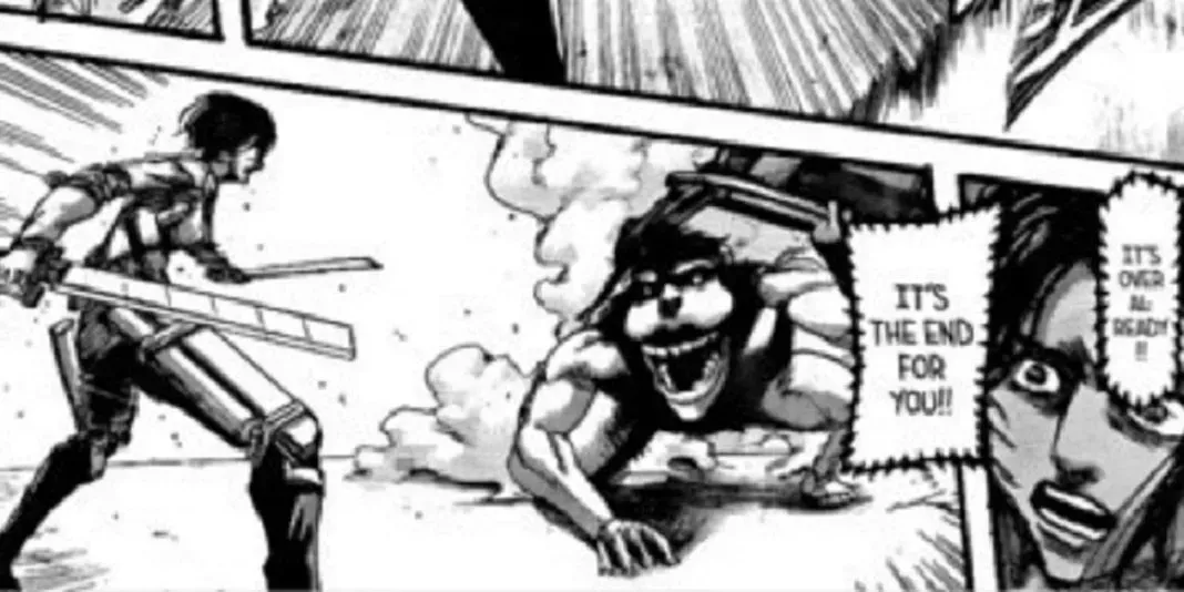 Después de que Eren fuera devorado, Mikasa y Levi se lanzaron a rescatarlo. Aunque este último se lastimó la pierna al recuperar a Eren, se las arreglaron para devolverlo a salvo detrás de los muros de Paradis. Además, ambos exploradores se hicieron una idea relativamente clara de quién era en realidad el Titán Femenino.