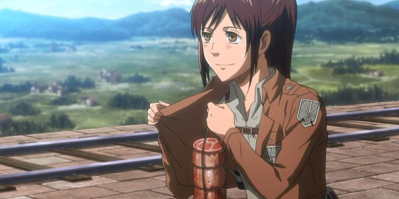 Lo primero que me viene a la mente sobre el Ataque a Titán es la muerte, el sufrimiento y el apetito de Sasha. Sasha es un personaje que Hajime Isayama añadió específicamente para llevar la comedia al anime. Ella es sólo una simple aldeana tratando de mezclarse con el resto.