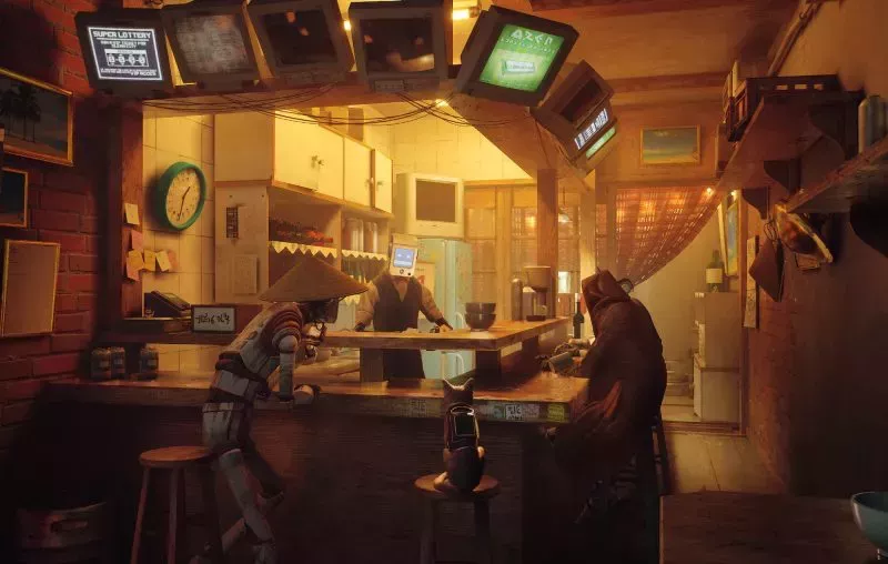A propósito, la historia y la ambientación de Stray es uno de sus elementos más intrigantes. Aunque el avance no ofrecía muchos detalles para evitar spoilers, la premisa básica es que el jugador se pone en la piel de un gato que ha tropezado accidentalmente con una ciudad surrealista habitada por robots. Lejos de ser fríos trozos de metal, estos robots son cálidos y agradables. Algunos se paran a charlar, otros están demasiado ocupados jugando al billar (o intentando jugar al dominó), y un robot especialmente cariñoso proyecta un emoji de corazón en su pantalla cuando te acuestas a dormir una siesta en su pecho.