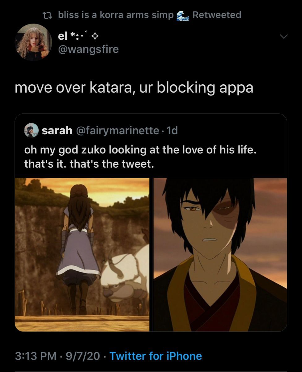 Los fans recordarán a Zuko que encontró a Appa encarcelado en Ba Sing Se y lo liberó. Appa también fue el primer miembro de la banda Avatar que aceptó a Zuko en su grupo. Asà que, sÃ, muévete, Katara. Fueron Zuko y Appa quienes obviamente se unieron antes que tú.
