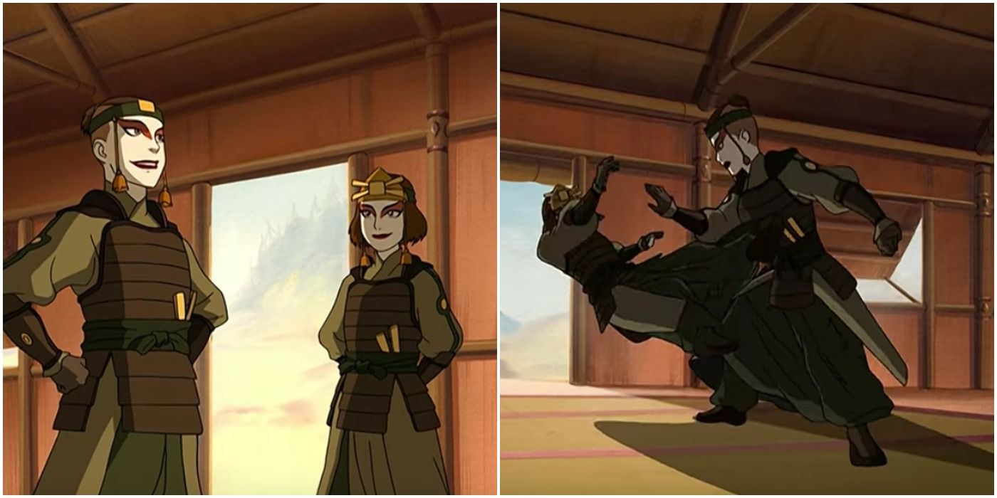 En la isla Kyoshi, el equipo Avatar fue atado y vendado por un grupo de guerreros extremadamente hábiles, que Sokka se sorprendió al saber que eran sólo "un montón de chicas". El les pregunto rudamente quienes eran, agregando, "¿Dónde están los hombres que nos emboscaron?" lo cual enfureció aun más a Suki.